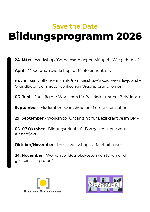 In Kooperation mit dem Kiezprojekt hat der Berliner Mieterverein ein vorläufiges Bildungsprogramm 2026 entwickelt.